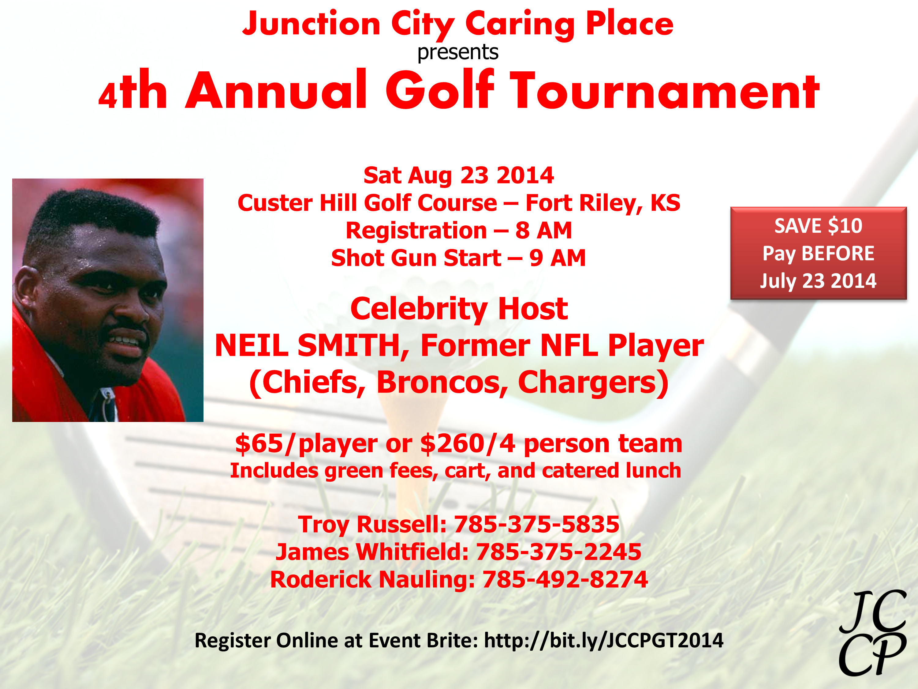 • The Junction City Caring Place 4th Annual Golf Fundraisers, to register go to http://lwim.org and sign up. The event is Saturday, August 23, 2014 at Fort Riley, Kansas Custer Hill Golf Course T time 9am. Registration is going now sign up early get a discount.